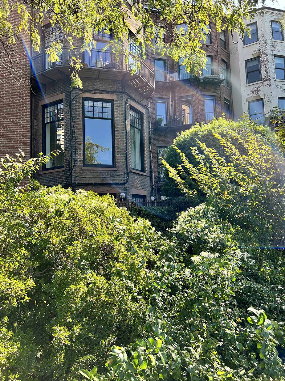 Daarna loop ik altijd even door naar de promenade waar je een adembenemend mooi uitzicht hebt over Manhattan, maar ook ongegeneerd kunt gluren in de achtertuinen van de bewoners van deze buurt. Voor een luttele acht miljoen staan de woningen op de markt.