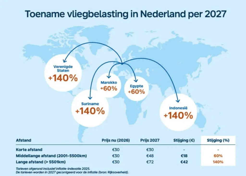 De verhoging raakt vooral passagiers op middellange en lange afstanden. Voor bestemmingen als Turkije, Egypte en Marokko stijgt de vliegbelasting in 2027 met ongeveer 60% naar €47,24 per persoon. Voor verre bestemmingen zoals de Verenigde Staten, Suriname en Azië loopt de heffing zelfs op met 140% tot €70,86 per ticket. Voor korte vluchten blijft het tarief €29,40.