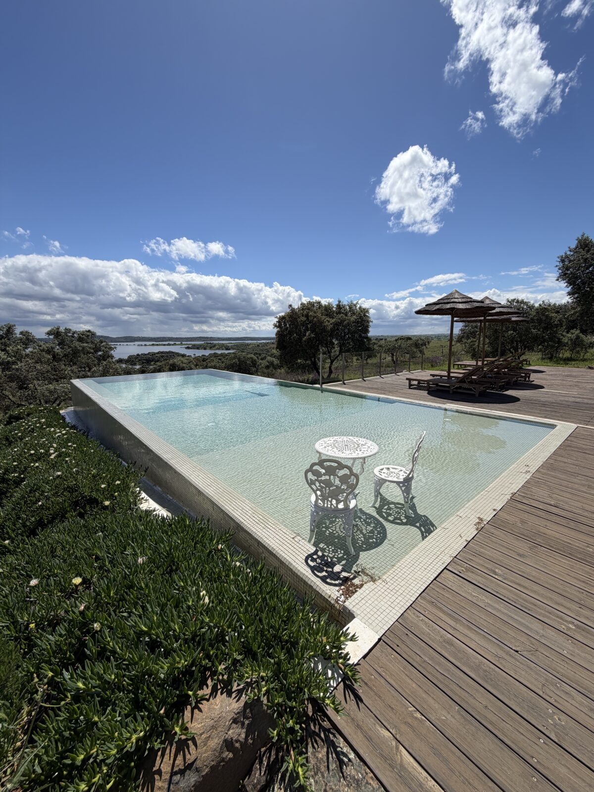 Voordat ik vertrek, neem ik nog één duik in de infinity pool. Hier komt alles samen. Terwijl je over de rand tuurt, vloeit het strakke water van het zwembad naadloos over in het Alqueva-meer. Geen filters nodig; de eindeloze horizon en de absolute stilte doen het werk. Het is de perfecte afsluiter.